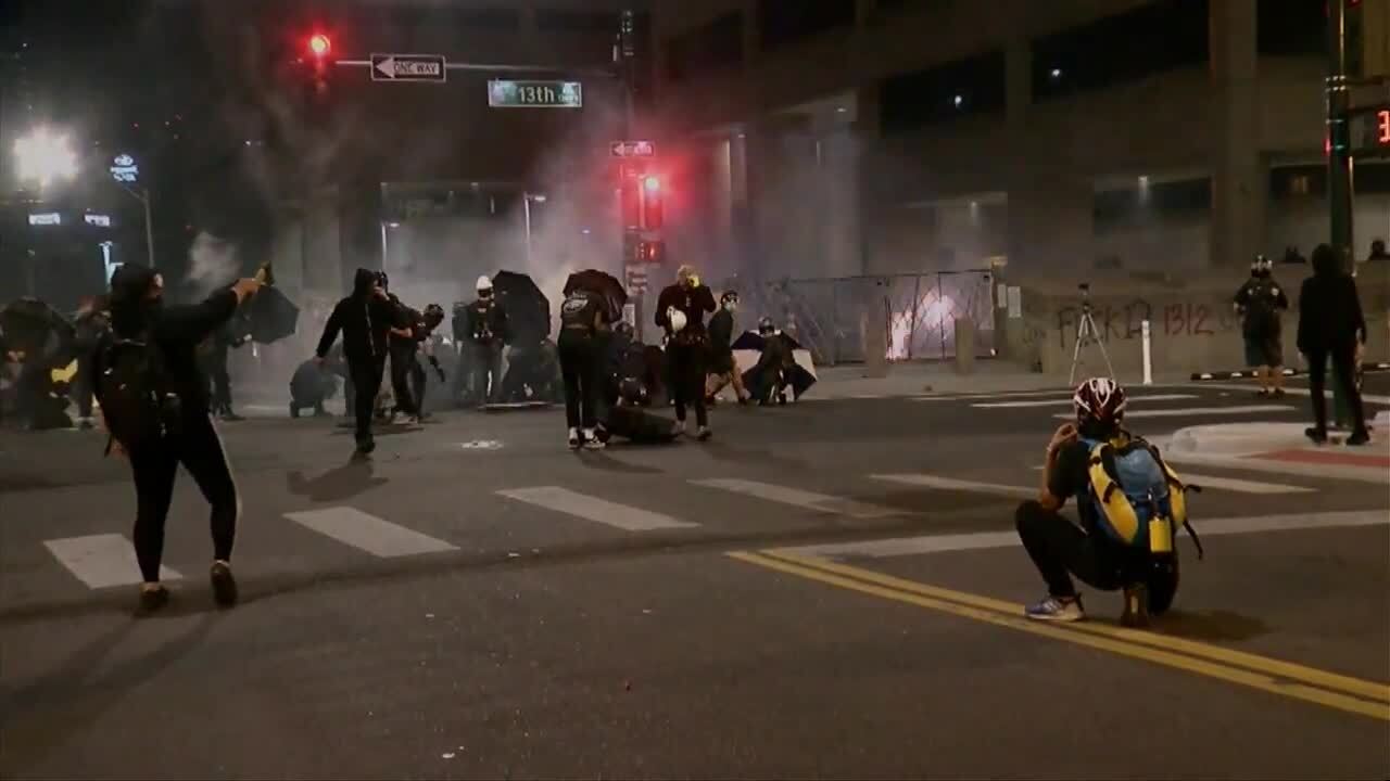 At one point, police clad in riot gear used nonlethal chemical munitions, including what appeared to be pepper balls and smoke. The protesters were seen throwing several fireworks into the area where the police were set behind the fence.
